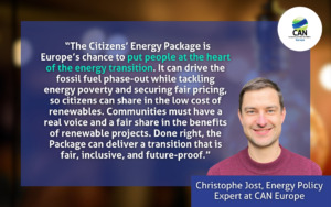 Beyond households, the Citizens Energy Package can give communities real ownership of the transition. Communities hosting renewable energy projects should have the right to participate meaningfully and to share fairly in the benefits. To achieve this, the Package must set binding EU-wide standards for community engagement and benefit sharing.