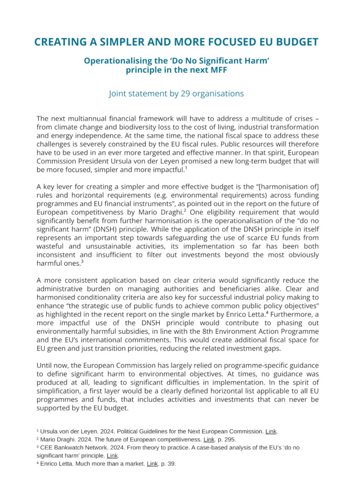 A key lever for creating a simpler and more effective budget is the “[harmonisation of] rules and horizontal requirements (e.g. environmental requirements) across funding programmes and EU financial instruments”, as pointed out in the report on the future of European competitiveness by Mario Draghi. One eligibility requirement that would significantly benefit from further harmonisation is the operationalisation of the “do no significant harm” (DNSH) principle. While the application of the DNSH principle in itself represents an important step towards safeguarding the use of scarce EU funds from wasteful and unsustainable activities, its implementation so far has been both inconsistent and insufficient to filter out investments beyond the most obviously harmful ones.