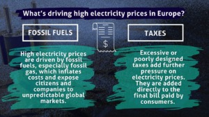 High electricity prices are driven by imported fossil fuels, particularly fossil gas, which are the main driver of price volatility and spikes, continue to set the price in many countries, inflate costs across the system and expose citizens and companies to unpredictable global markets. Slow growth and modernisation of Europe’s electricity grids also contribute to high prices, as limited transmission and capacity leads to curtailment of cheap renewable energy and continued reliance on fossil backup plants.Excessive or poorly designed taxes add further pressure to prices. These taxes are added directly to the final bill paid by consumers, and tax structures often inflate electricity costs unnecessarily. In many countries, electricity is taxed more heavily than fossil fuels like gas, which makes electrification less attractive.
