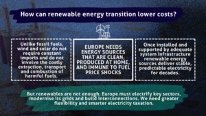 Renewable energy can lower energy costs through a combination of low operating costs, efficiency gains, and smart grid investments. Wind and solar have virtually zero fuel costs, so once built, they produce electricity at a fraction of the cost of fossil-fueled plants. This reduces the wholesale price of electricity and shields consumers from volatile fossil fuel markets. Evidence from the European Environment Agency shows that expanding renewables and electrification could reduce EU wholesale electricity prices by up to 57% by 2030, from around €91.7/MWh in 2023 to about €39.9/MWh, as renewable generation displaces gas-fired power and reduces exposure to imported fuels. Households and businesses can further lower bills by saving energy through efficiency measures, such as insulation, heat pumps, and smart demand management, which reduce consumption during high-price periods.Over the medium and long term, investing in grid expansion, storage, and flexible resources maximizes the value of renewables and stabilizes prices. Flexibility allows the system to balance supply and demand efficiently, preventing spikes when wind or solar output is low, and substitutes gas as the price setter. A 2025 system-cost analysis by WindEurope finds that a renewables-based energy system is the lowest-cost pathway for Europe, potentially saving up to €1.6 trillion by 2050 compared with slower transition scenarios, even when accounting for investments in grids, storage, and system flexibility. By combining low operating costs with smarter use of electricity and robust infrastructure, the renewable transition creates a more resilient energy system and delivers predictable, lower bills over time.