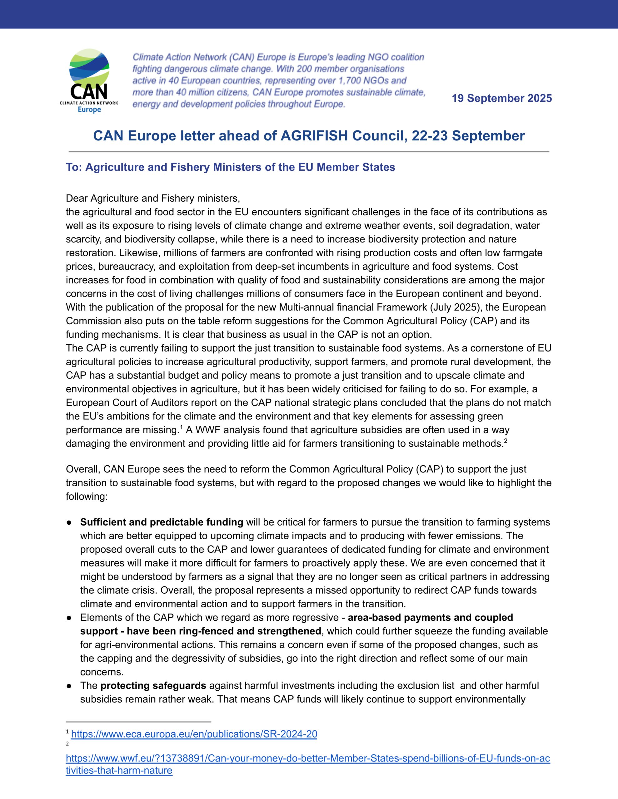 Letter: Common Agricultural Policy to support the just transition to sustainable food systems
