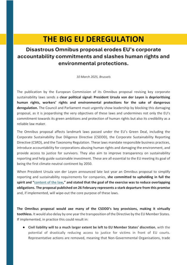 Download the full Joint Statement Response to EU Call for EvidenceThe publication by the European Commission of its Omnibus proposal revising key corporate sustainability laws sends a clear political signal: President Ursula von der Leyen is deprioritising human rights, workers’ rights and environmental protections for the sake of dangerous deregulation.