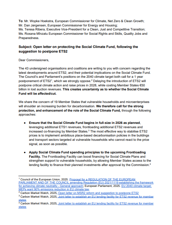 43 organisations and coalitions sent an open letter to the Commissioners — Wopke Hoekstra, Dan Jørgensen, Teresa Ribera and Roxana Mînzatu — raising concerns about recent developments around ETS2 and what they could mean for the Social Climate Fund.