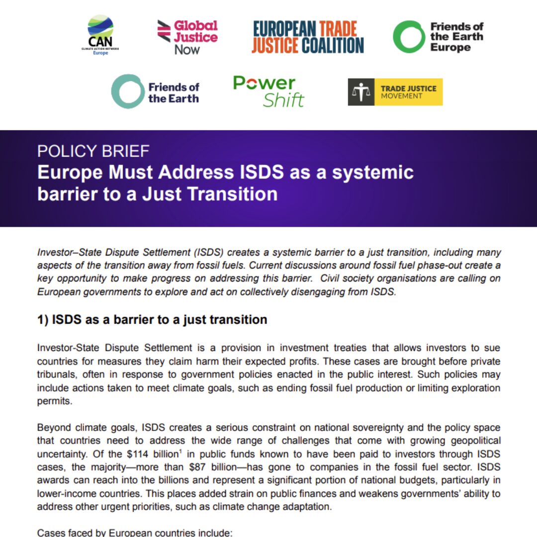 Investor–State Dispute Settlement (ISDS) creates a systemic barrier to a just transition, including many aspects of the transition away from fossil fuels. Current discussions around fossil fuel phase-out create a key opportunity to make progress on addressing this barrier. Civil society organisations are calling on European governments to explore and act on collectively disengaging from ISDS.