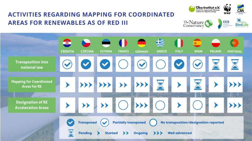 This joint analysis conducted by the Oeko Institut, CAN Europe, WWF EPO, Birdlife Europe and Central Asia, the European Environmental Bureau and The Nature Conservancy provides an update on the progress of 10 EU Member States on their transposition of the Renewable Energy Directive (RED III), their implementation of spatial mapping and planning for renewables and the designation of renewable acceleration areas (RAAs). This analysis is an update on the 2024 report and reveals mapping processes have been initiated in almost all countries, or RED III stipulations have been integrated into existing spatial planning processes for RE areas.